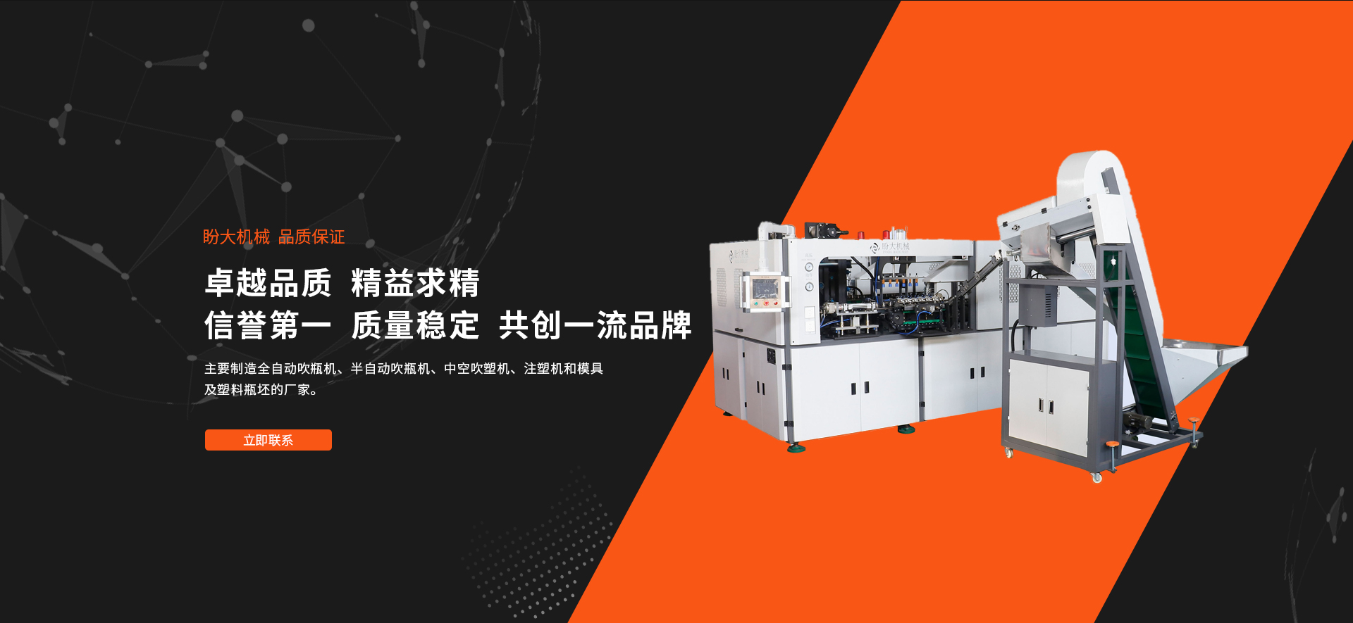 臺州盼大機械有限公司座落于東海之濱, 著名的“蜜桔之鄉”和“模具王國”—浙江黃巖。主要制造全自動吹瓶機、半自動吹瓶機、中空吹塑機、注塑機和模具及塑料瓶坯的廠家。本廠擁有多年的生產經驗,采用進口和國產的高質量生產設備和檢驗儀器。MT系列多功能吹瓶機是本廠生產和研發的一種操作簡單、成品率高、適用性廣、可靠性穩定的吹瓶機。采用進口的先進氣動元件,設計以高效益,高精度,維修安全,集美觀耐用于一體。